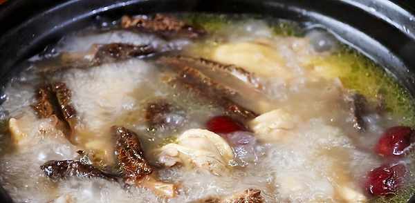 3。准备炖汤,将鸡块放入其中,加入切好的姜片、葱片、红枣和羊肚菌炖40-60分钟;