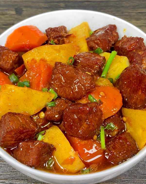 【番茄菲力】主料:牛胸肉、番茄、土豆、胡萝卜、葱花、酱油、料酒、蚝油、八角、月桂叶、姜片、软烂的牛肉,满满的酸甜番茄汁,美味合一,太满足了,午饭能吃到这一碗绝对是幸福的。
