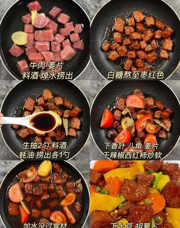 2.锅内油烧热至50%,加入糖,煮至红紫色,加入牛肉炒色,加入2汤匙生抽,1汤匙蚝油老抽。和料酒,然后加入月桂叶、八角和姜片,炒香,然后加入西红柿。