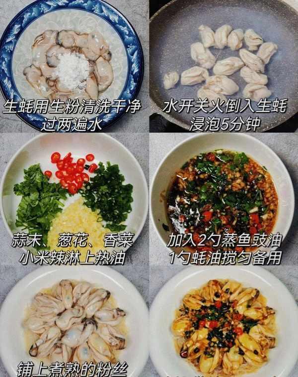 1、将生蚝放入碗中,用生面粉洗净,用水冲洗两遍,然后烧一锅水,水开后放入生蚝,关火,盖上锅盖浸泡5分钟。泡的时候把粉丝泡熟备用。