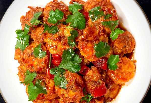 2.锅中油烧热至油温的60%,将切碎的大蒜、小米、辣椒等调料炒香。出味后,加入虾仁翻炒2圈。将大虾炒至生熟,然后加入准备好的酱汁,置中火翻炒。将酱汁炒1-2分钟。