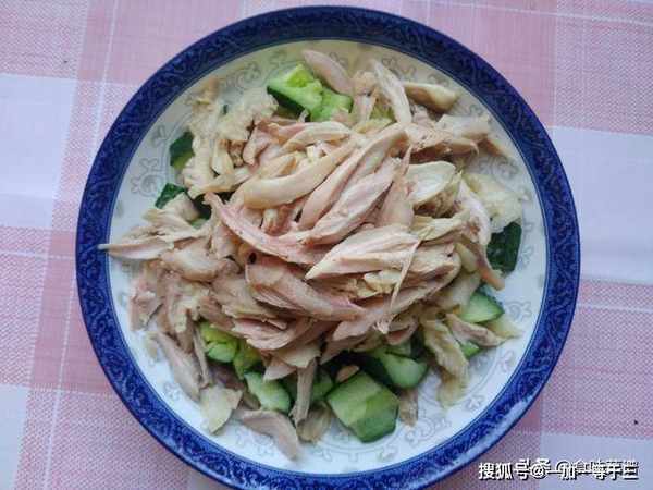 4、鸡腿先浸入凉水,等自然冷却,撕成细丝,铺在黄瓜上面。