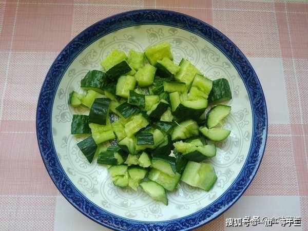 3、黄瓜拍一下,切成滚刀块儿,装入盘子中。