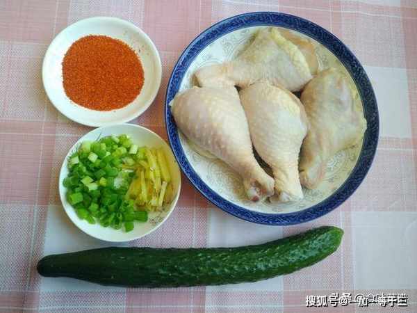 1、准备4个鸡腿,一根黄瓜,适量葱、姜,适量辣椒面。