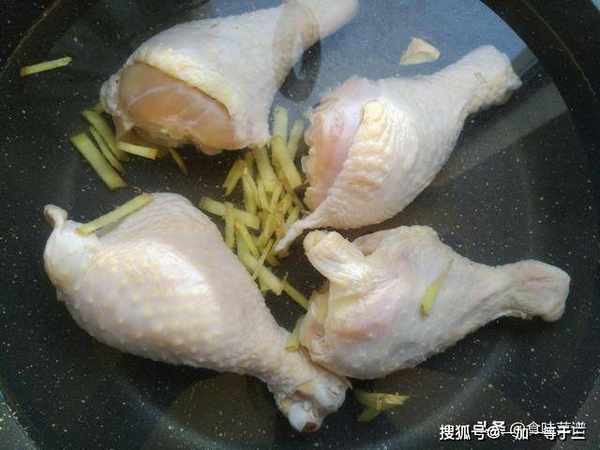 2、锅内烧水,放入鸡腿,一小把姜丝,适量料酒,煮8-10分钟左右,时间过久,鸡肉就老了,撇去浮沫。