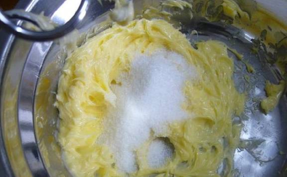 1、将黄油软化后略打,中间分几次加入糖打至羽状微白(打发时间不宜长)。