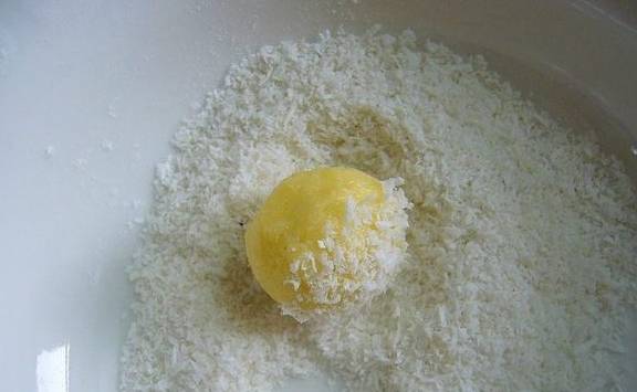 3.搅拌好后,捏成均匀的小球状,分别在剩余椰蓉里滚几下,使表面均匀粘上椰蓉。