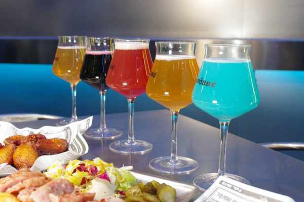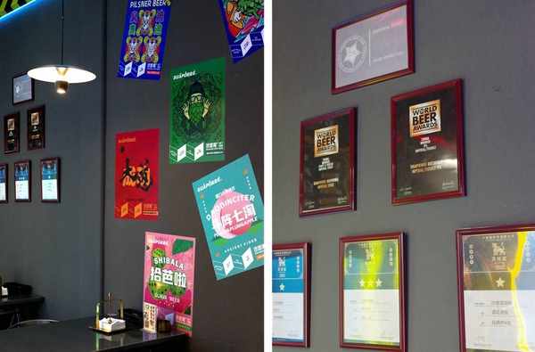 这个位置是荣誉展示区,虽然沙坡尾这个精酿品牌诞生不久,但口味已经从早先7-8种发展到多达30种,且显而易见还会不断推陈出新。这边是获奖品类的荣誉介绍,有国内的“天禄奖”,也有的甚至已经斩获精酿啤酒评选的最高奖“欧洲之星”,确实很厉害。