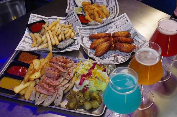 在这样以各种精鲜酿啤为主打的小酒馆,肯定重点在于喝酒,在于多品尝几款不同风味的啤酒口感和香味。其实人家佐酒小食也蛮丰富,除了现炸的薯条,洋葱圈,还有酸黄瓜,鸡肉肠,烤鸡翅,坚果仁等,基本满足配啤酒的功能。