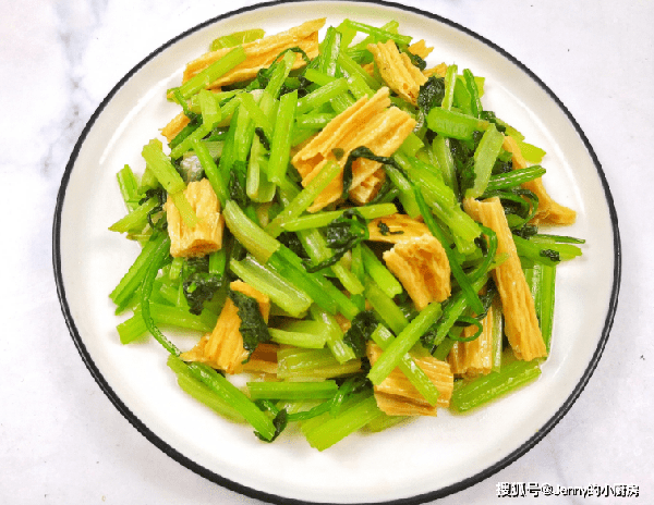 炒半分钟后倒入腐竹翻炒均匀,再加盐、鸡精,炒到芹菜断生,这道菜就做好了。