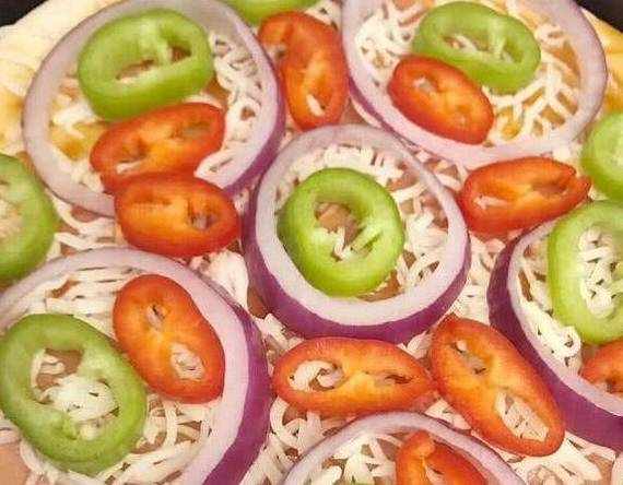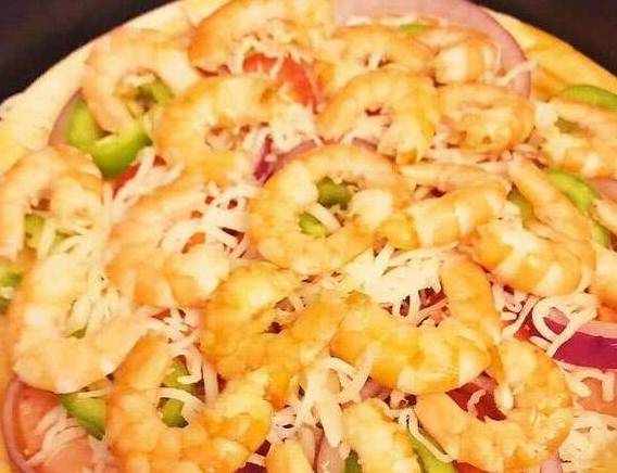 当然,披萨上面还需要加上一些青椒洋葱什么的,我们只需要将青椒、红椒、洋葱什么的煎好,然后直接放在披萨上就可以了,刚好我们家还有一些虾仁,所以我又放了一些虾仁上去。