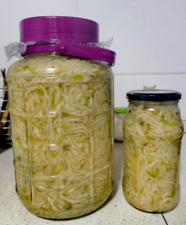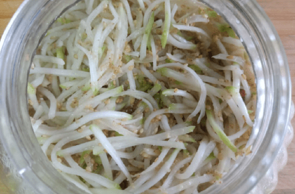 趁热装入密封的玻璃罐子中,按压紧实,盖上盖子。待凉透放入冰箱。2天后,呛鼻子的芥菜丝就制作好了。