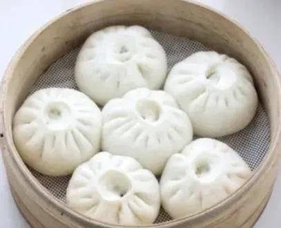F。把调好的肉馅放在擀好的面团上,慢慢捏住面团,把面团包起来,再发酵15分钟,然后用大火蒸15分钟。