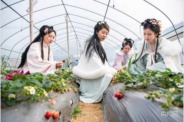 汉服小姐姐+粉嫩的草莓,别有一番风味(央广网发 通讯员供图)