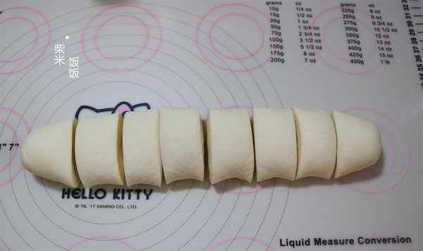 2.将醒好的面团转移到揉面板上,揉至光滑。然后揉成长条,分成8等份。