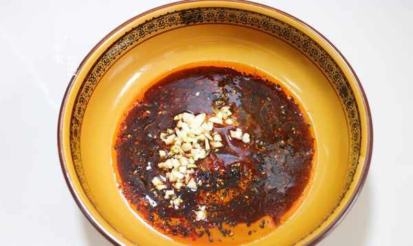 5.将辣椒粉和芝麻放入碗中,倒入热油,炸香。加入盐、鸡精、生抽1勺、香醋2勺、香油、蒜末调味。你把它放在一边,你忽略它。