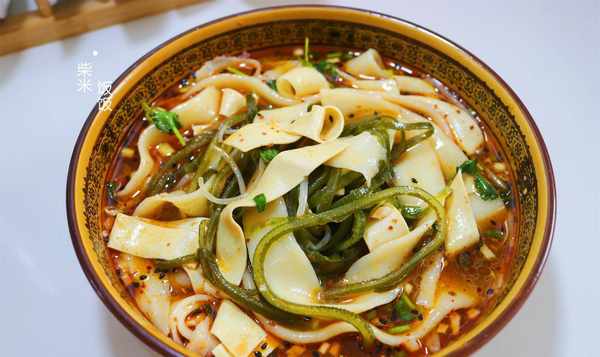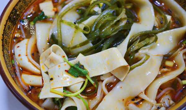 【原料】面粉,紫菜丝,绿豆芽,豆腐皮,盐,辣椒粉,芝麻,葱,香菜,生抽,香醋,香油