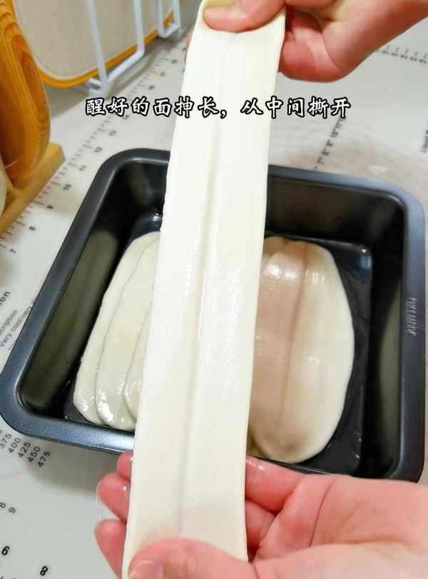 6.把醒好的面团擀成上图,面团的厚薄随自己喜欢,然后从筷子凹陷的地方撕开。这就是我们推出两个面团的方式。