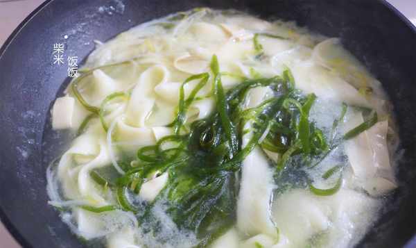 8.根据自己的口味加入一些配菜。这里我加了切碎的紫菜、豆腐皮和绿豆芽。让它煮一段时间,直到意大利面煮熟,然后关火。
