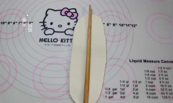 3.将小部分卷得又长又薄。用一根棍子在中间标记它。