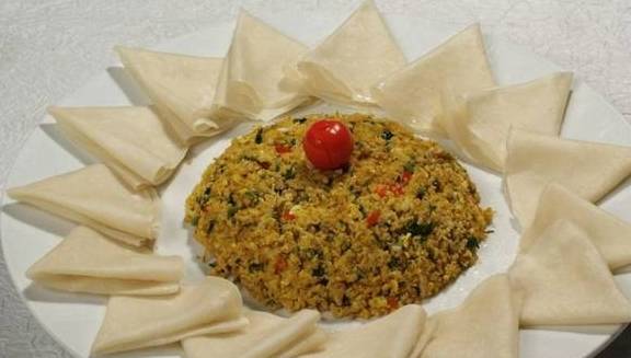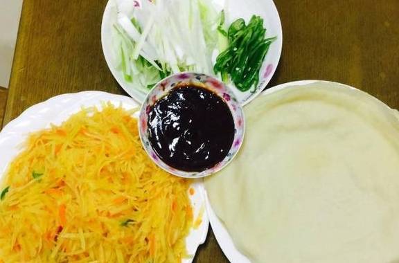 将自己喜欢的小菜准备好,涂上甜面酱,放入准备好的黄瓜丝、火腿丝、绿豆芽、葱丝、土豆丝、蛋皮丝即可。(同样你也可以做一道炒菜与春饼搭配也很好)。