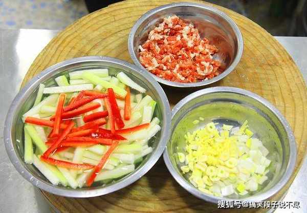 1.准备猪肉一块,先切成片再改刀切成肉粒。瓠子一个 削去外皮,切成几小段,把瓜瓤去掉切成粗条,放在盆中加入清水浸泡。红椒一小片切成红椒丝、大葱白一段划开 切成葱花、生姜一小块切成细丝、大蒜几粒切成蒜片。