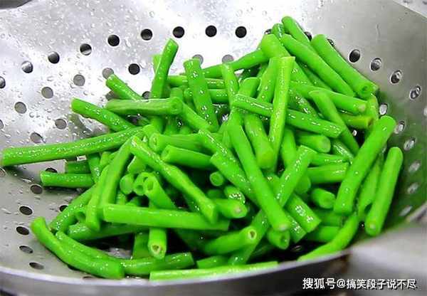 2.锅内烧水,把豆角倒入锅中的同时,加入一勺食盐入底味,淡盐水煮出来的豆角,颜色更加翠绿,大约煮2分钟,把豆角煮熟以后倒出来,快速过一下凉水以免豆角回软,把水分控干,放入盆中备用。