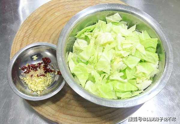 1.准备包菜半个,先去掉根部再切成小块放在盆中,清水浸泡清洗。大蒜几粒拍扁,切成蒜末放在小盆中,抓入几粒红干椒,一点白芝麻。