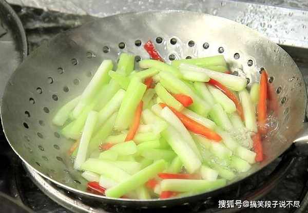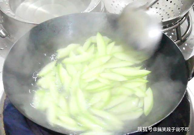 2.锅内烧水,加入食盐2克,淋入一点植物油,加入一点白醋,把瓠子和红椒片一起焯一下水,瓠子焯水在后面的快炒中 生熟能一致,水开以后倒入瓠子快速焯一下,捞出凉水冲洗,凉水冲洗能使青菜的口感更脆嫩。