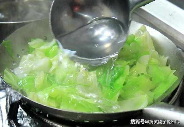 2.锅内烧水,淋入一点植物油,加入食盐2克,水烧开以后把包菜倒入锅内,淋入植物油可以使包菜焯水出来颜色更鲜亮,焯水40秒钟,捞出来用凉开水快速冲洗,这样能保持包菜的鲜嫩,包菜控干水分以后倒在盆中。