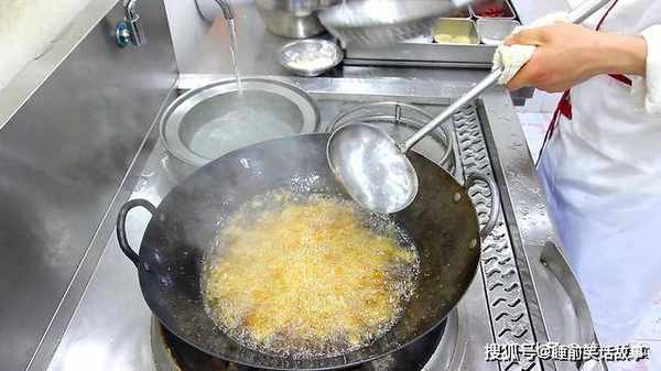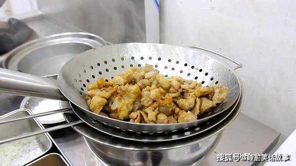 4.把油温升到6成热,下入羊肉复炸20秒钟左右,炸至羊肉金黄倒出控油备用。