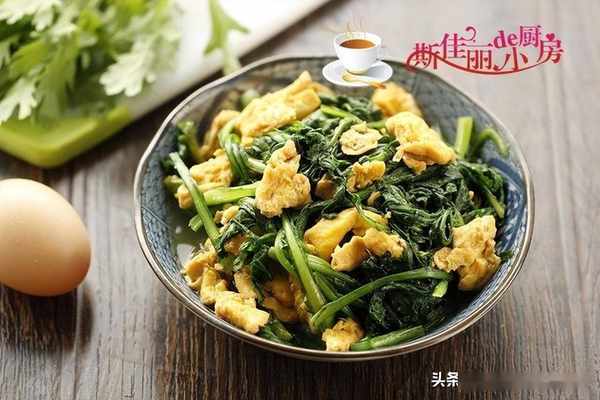 制作: 鸡蛋加入少许盐和料酒, 打散备用;烧热锅放入适量的油, 倒入打散的蛋液煎至微微定型后用筷子划散成小块后盛入碗中备用;热锅凉油,将洗净的茼蒿进去翻炒微微变色,加入盐翻炒均匀,最后放入鸡蛋翻炒均匀即可。