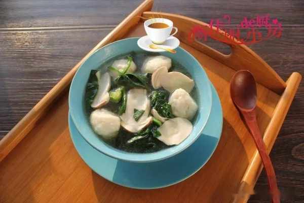 原料:菠菜 鱼丸 松茸菇 胡椒粉 油盐