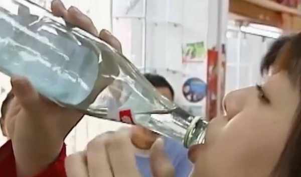 只见她“咕咚咕咚”就喝完了一瓶酸奶,喝完以后拿起桌上的白酒便对着瓶吹了起来,