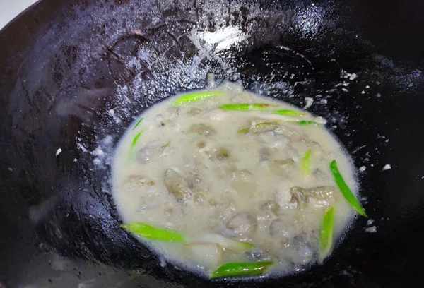 5.如果锅里的海蛎和淀粉水慢慢煮开,里面的汤会比较浓稠。煮约两分钟。煮熟后,我们还将准备好的蒜叶倒入其中;