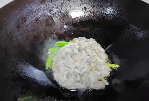 4.海蛎直接下锅容易缩水,所以我们加点淀粉,然后这样煮,做成QQ弹,减少它的缩水,这样不仅海蛎好吃,而且淀粉也很好吃。然后我们用铲子稍微搅拌一下,然后我们往里面倒一点水,水可以多一点,然后用铲子翻动一下,加入适量的盐和酱油,炒匀;