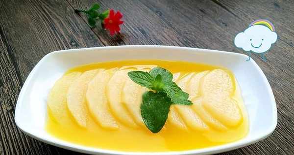 (3)橙子去皮,榨汁,加糖拌匀;将橙汁放入碗中,将梨浸泡40分钟。