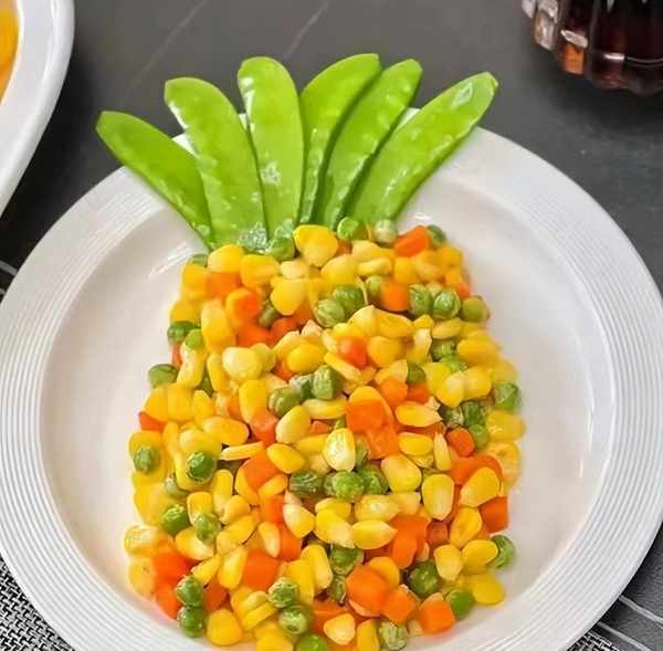 1.水烧开,加盐,少许油,将荷兰豆、青豆、胡萝卜和玉米焯水
