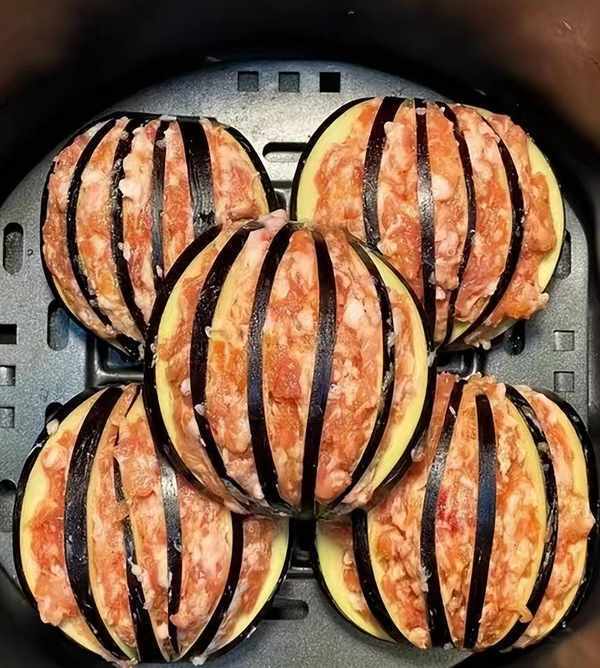 3、将肉末塞入茄子中心,表面抹少许油,180度烤10分钟