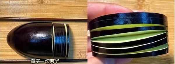 1.茄子切成两段,然后切成等薄片,第六刀切段