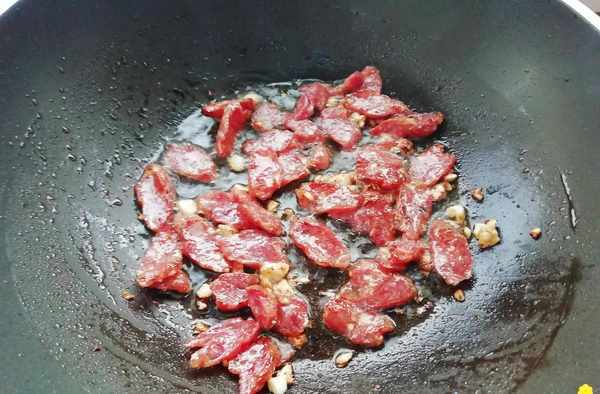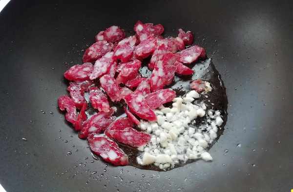 2、起锅倒入少许油,放入蒜末和腊肠,保持文火煸香。