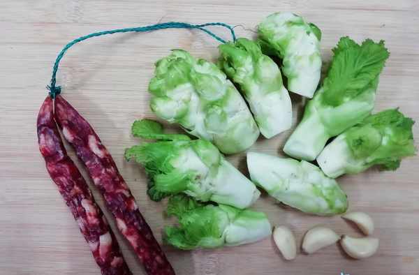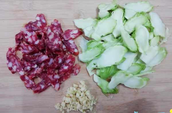 1、腊肠去掉外膜,斜刀切成薄片;儿菜洗净切成片,蒜头拍扁切成末。
