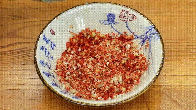 然后我们开始做蘸酱,把大蒜拍扁切成沫,生姜切成丝再切成粒放入小碗中。再倒入两勺的辣椒粉搅拌均匀。