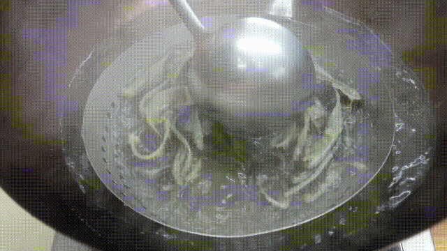 3.最后我要把毛肚焯一下水,水开以后我们把薄毛肚烫15秒捞出来控水,切成条的厚毛肚,烫30秒就可以了。
