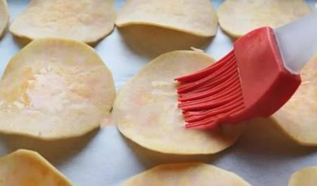 将红薯片放到格子上面,晾干水分。如果着急吃,也可以用厨房用纸擦干。烤盘上面铺上一层油纸,将红薯片放上去,两面都刷上一层薄薄的油。烤箱提前预热,放入烤盘,180度烤10分钟,取出来翻翻面,刷上一层蜂蜜(也可不刷),继续烤10—15分钟。好吃嘎嘣脆的红薯片就做好了。