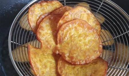 除了烤箱,大家还可以用油炸。锅中放入适量的油加热到五成热,将红薯片直接放到锅里面。开中小火慢炸,一边炸一边用筷子搅拌,使薯片均匀的上色。炸到金黄色,马上捞出来控油。炸好之后还可以趁热撒上白糖,就可以开吃了。