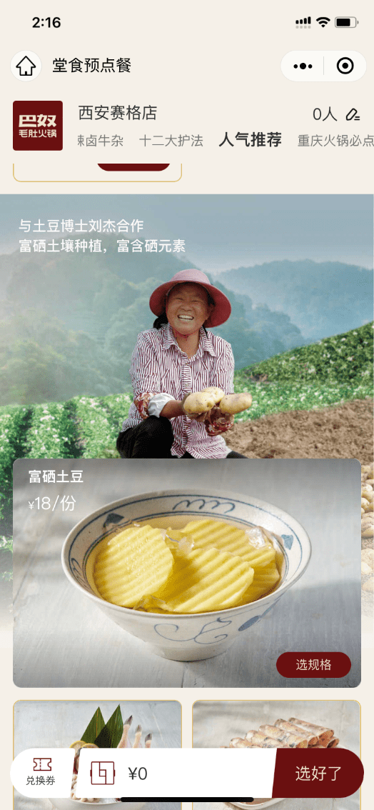 巴奴火锅小程序菜单页显示,该土豆为店内的“人气推荐”,“与土豆博士刘杰合作”,大份18元小份9元,但未显示份量规格。