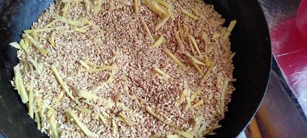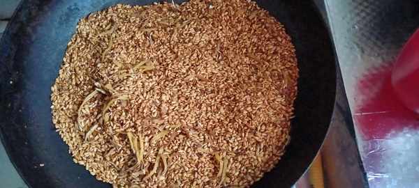 3、继续小火翻炒至大米发红,姜丝干燥即可(姜丝用手去捏,能折断),关火后继续翻炒3-4分钟,防止锅底的烧焦。