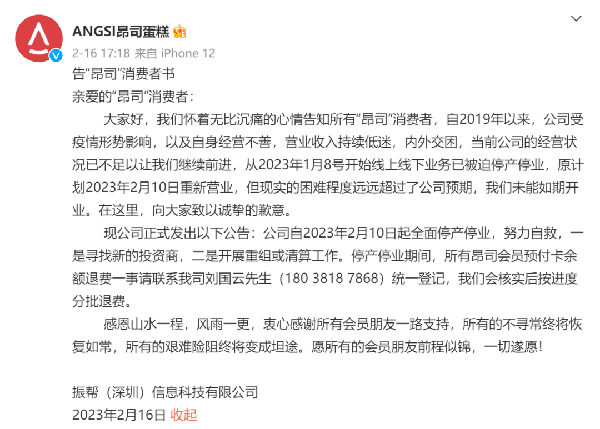 2月16日晚间,昂司蛋糕在官方微博上发布公告,称受疫情影响企业经营不善,品牌门店无法在春节后如期开业。“公司自2023年2月10日起全面停产停业,努力自救,一是寻找新的投资商,二是开展重组或清算。”
