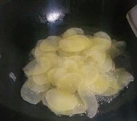 4.锅里放适量植物油,油至大概七成热热之后,下土豆片,转小火炸。火够小的话,可以炜熟担保持土豆片柔软不炸焦。